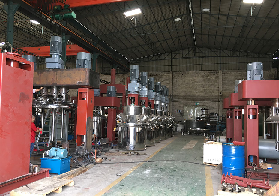 2、效率高,不論是用作於基料生產,還是製膠調色等工序(xù)都很有(yǒu)很(hěn)高的生產效率。原來基料生產幾乎都采用捏合(hé)機,其缺點(diǎn)是:時(shí)間長、能耗大、效果(guǒ)不佳(顆粒多),改用強力分散機生產基料就可以大大(dà)改良這些問題,時間大約是原來的1/3;製膠生產原來有(yǒu)一(yī)部分是采用行星攪拌機,其缺點是:時間長、效果不好(hǎo),改用強力(lì)分散機(製膠機),生產(chǎn)時間更快,效(xiào)果也明顯(xiǎn)提高。