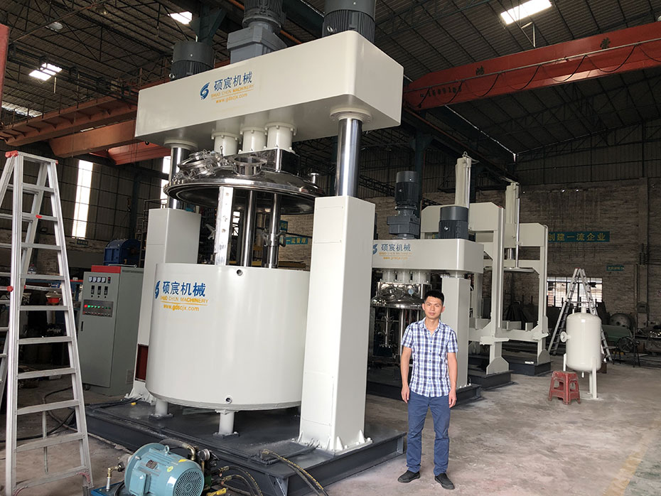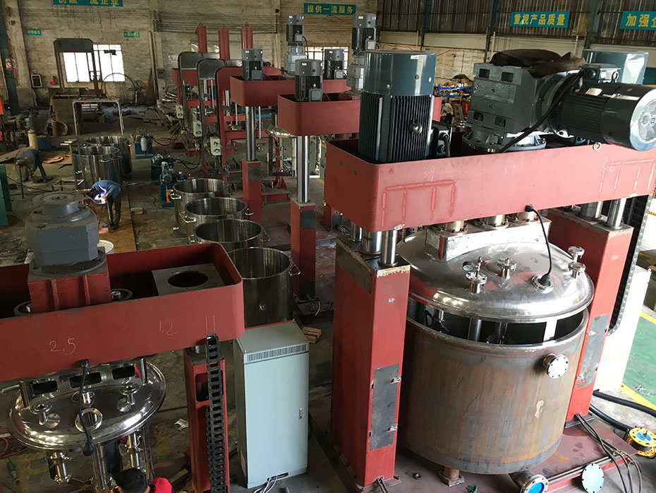 其中強力分散機(製膠機)是矽酮(tóng)密封膠、玻(bō)璃(lí)膠、結(jié)構膠的生產設備(bèi)中的主要(yào)組成部分(fèn),也是矽酮膠、玻璃膠的整條生產線中為重要設備部分。強力分散機是一種快(kuài)速(sù)攪拌機,有三個動力驅動的電動機(jī),釜內(nèi)有三根不同形(xíng)式、高低速結合的攪拌(bàn)器;是一種應用行業(yè)廣泛、密封性好、可抽真空、具有良好的脫泡效果、攪拌無死角、高低速結合(hé)、攪(jiǎo)拌分散充(chōng)分快速的(de)混合攪拌設備。若(ruò)想要了解更多的工況,您可以提出您所需要的處理量、設備形式、規格要求或您需要加工的物料的性質,根據您的情況91网站的銷(xiāo)售工程師會提(tí)供讓您滿意(yì)的方案。